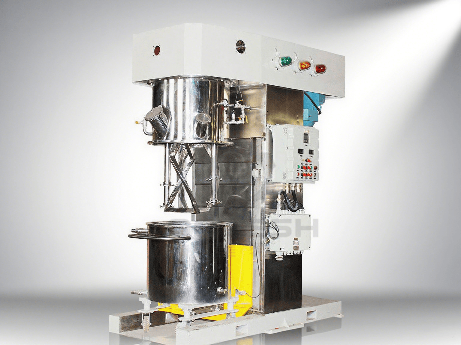 三軸多功能攪拌機多功能攪拌機集低速強力攪拌和高速分散/乳化多功能于一體,對中高粘度及觸變性物料具有很好的適用性,對于攪拌、分散/乳化可同時進行,能獲得理想效果。該機適用于各種物 -